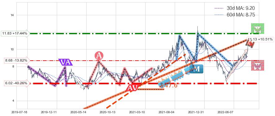 ♘ 支撑价格位8.68,可信任强度44.10%,距离最后交易2022-08-12形成的收盘价格10.07相差 -13.82%
