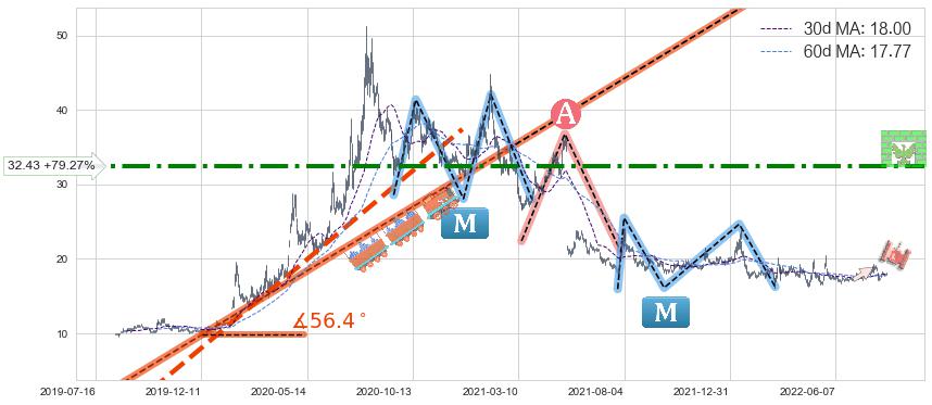 ♘ 阻力价格位32.43,可信任强度77.11%,距离最后交易2022-08-12形成的收盘价格18.09相差 +79.27%