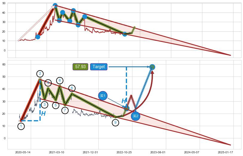➢ 最小中继整理涨幅→𝐇: 33.52 (𝐇楔型旗杆的长度:楔型起点→顶点)