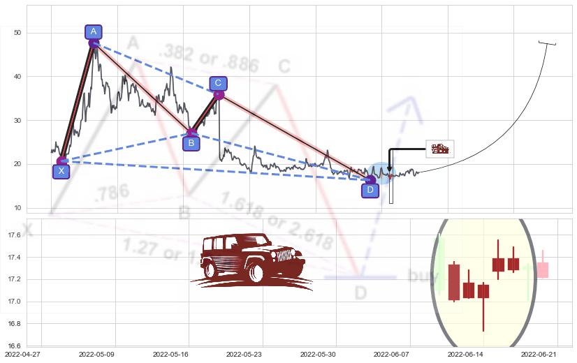 ➣ 谐波蝴蝶:c下跌到达d:猜想拉升 → 上涨 →【拐点】强支撑临近 → 大趋势均值回复