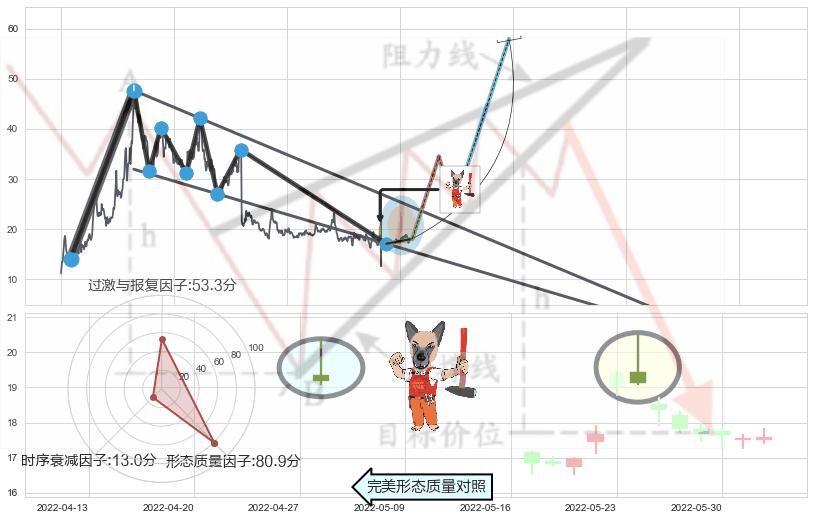 ➣ 锤头线(锤子线) + 降楔型临近阻力猜想转换支撑上涨信号叠加后【目标达成率】低,【看多】信号叠加【存续影响大】