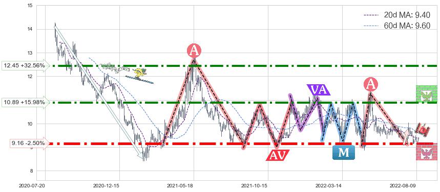 ♘ 支撑价格位9.16,可信任强度96.31%,距离最后交易2022-08-12形成的收盘价格9.39相差 -2.50%