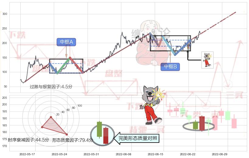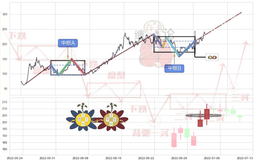 ➣ 【中枢B】:2021-12-30-2022-07-04,中枢由5笔构成,共121交易日, ZG=209.77, ZD=188.81