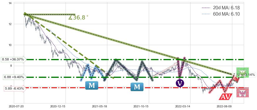 ♘ 阻力价格位6.88,可信任强度84.75%,距离最后交易2022-08-12形成的收盘价格6.29相差 +9.40%
