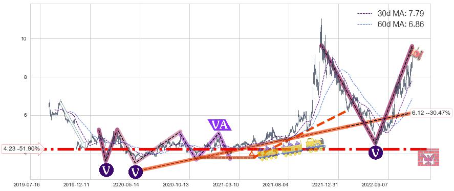 ♘ 支撑价格位4.23,可信任强度99.00%,距离最后交易2022-08-12形成的收盘价格8.80相差 -51.90%