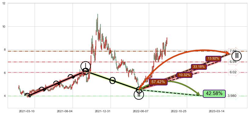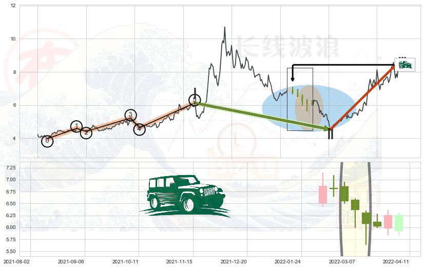 2022-04-26: 第一支撑位4.23有效抑制了下跌浪,成功阻止了价格的继续下跌。