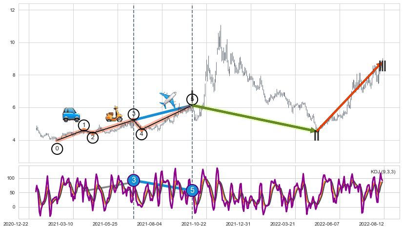 ➣ 第三,五驱动浪端点:【KDJ】走势出现【常规背离 & 反转信号】背离程度97.04%,背离夹角角度62.2˚,背离程度中等