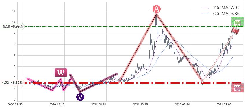 ♘ 阻力价格位9.59,可信任强度55.00%,距离最后交易2022-08-12形成的收盘价格8.80相差 +8.99%