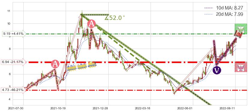 ♘ 阻力价格位9.19,可信任强度54.00%,距离最后交易2022-08-12形成的收盘价格8.80相差 +4.41%