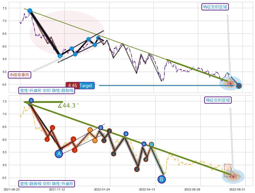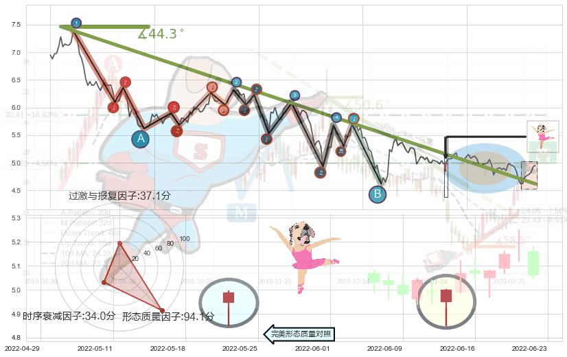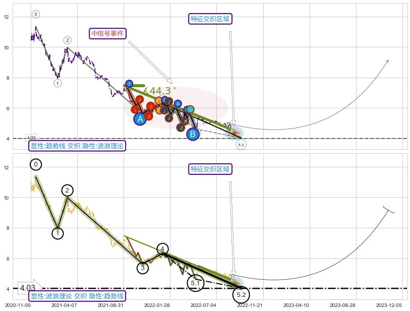 ➢ 2021-09-01-2022-05-09下跌趋势存在反转上涨[机会],其原下跌趋势的阻力位(4.62)已被突破[强支撑信号],原下跌趋势角度: 44.3˚