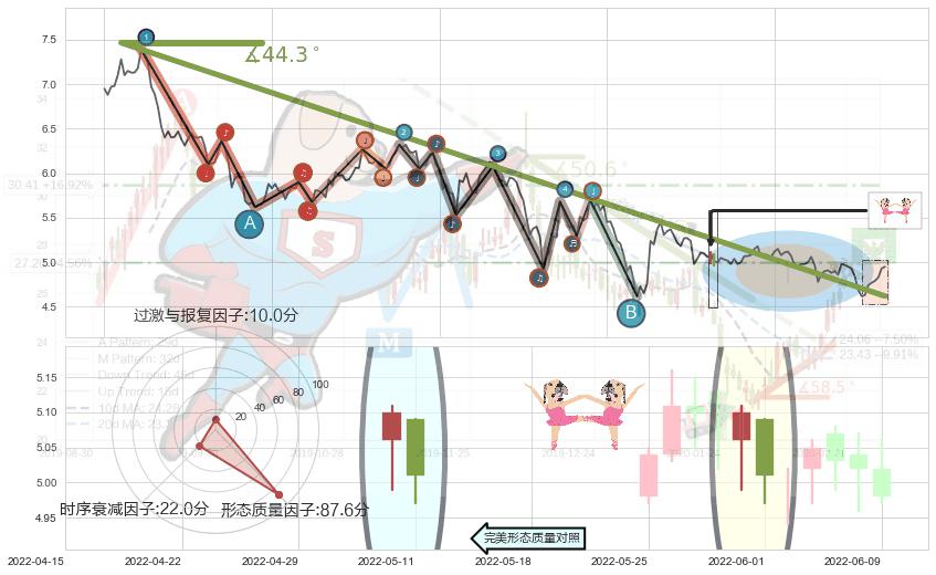 ➣ 2021-09-01-2022-05-09下跌趋势存在反转上涨[机会],其原下跌趋势的阻力位(4.62)已被突破[强支撑信号],原下跌趋势角度: 44.3˚
