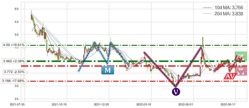 ♘ 阻力价格位3.962,可信任强度86.10%,距离最后交易2022-08-12形成的收盘价格3.870相差 +2.38%