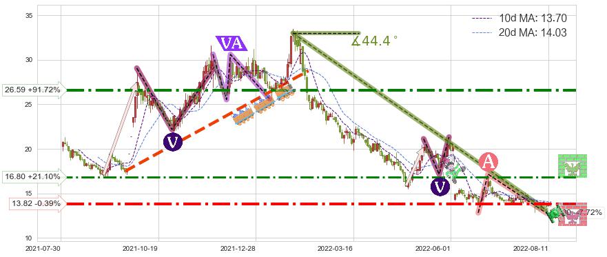 ♘ 阻力价格位26.59,可信任强度81.25%,距离最后交易2022-08-12形成的收盘价格13.87相差 +91.72%