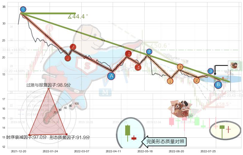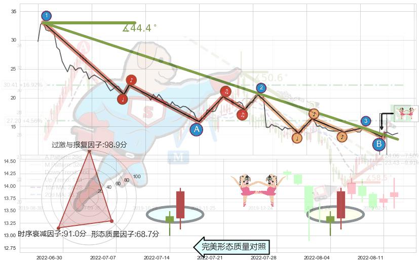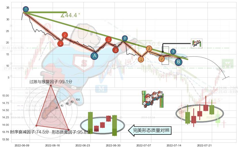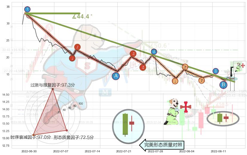 从2022-01-25至2022-08-12,共包含133个交易日,阶段股价下跌-76.54%,阶段股价变动位移路程比: 1 : 4,下跌趋势角度: 44.4,2022-06-06向↘︎形成缺口,跳空下跌-26.24%˚