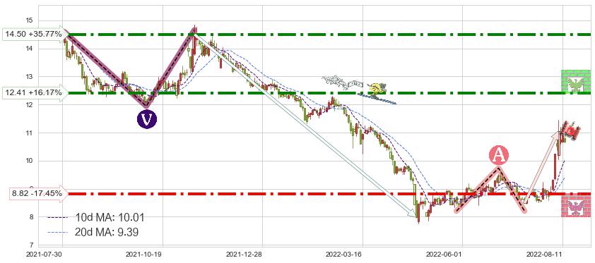 ♘ 阻力价格位14.50,可信任强度73.15%,距离最后交易2022-08-12形成的收盘价格10.68相差 +35.77%