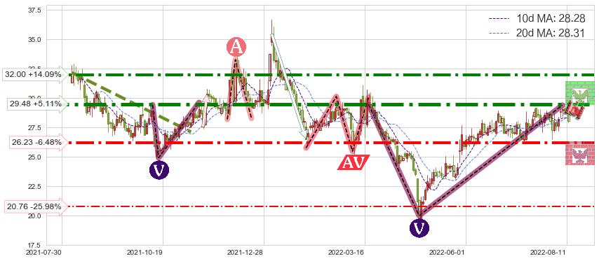 ♘ 阻力价格位29.48,可信任强度91.92%,距离最后交易2022-08-12形成的收盘价格28.05相差 +5.11%