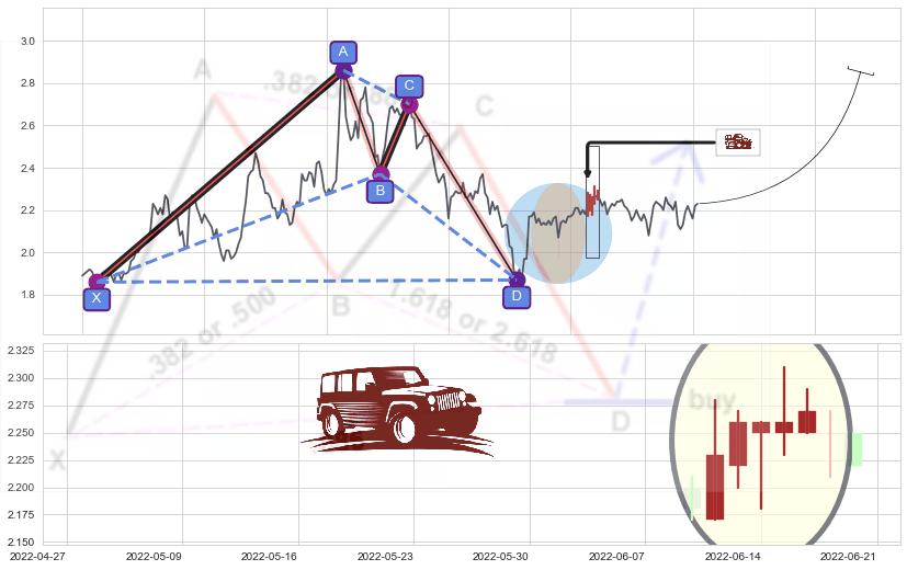 ➣ 谐波蝙蝠:c下跌到达d:猜想拉升 → 上涨 →【拐点】强支撑临近 → 大趋势均值回复