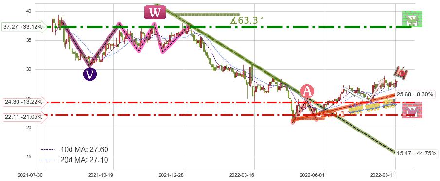 ♘ 阻力价格位37.27,可信任强度98.34%,距离最后交易2022-08-12形成的收盘价格28.00相差 +33.12%