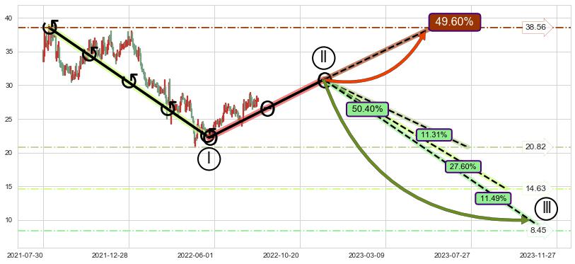 ➣ 循环浪继续向下【平均值】位置(2023-09-22, 14.63),匹配聚类样本比例54.75%, 可能性概率27.60%