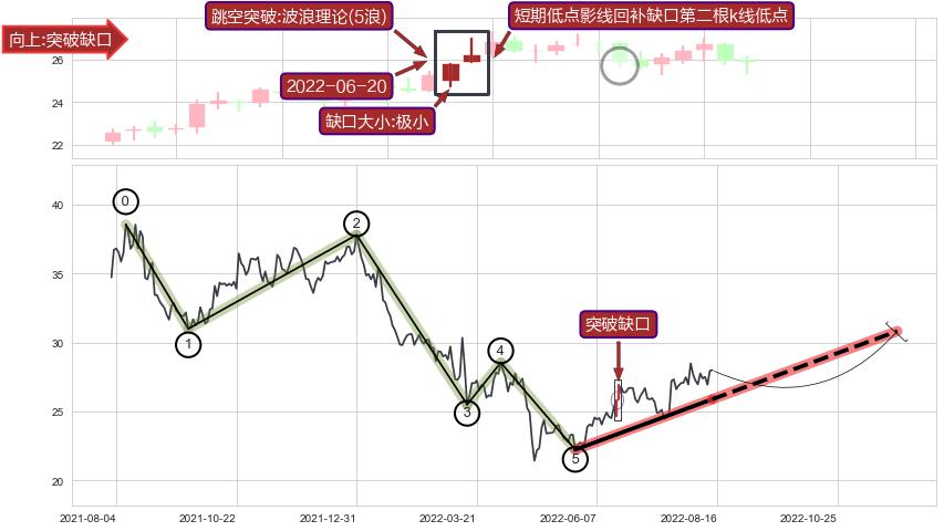 ➣ 突破缺口形成后,后续k已经超过14根,跳空突破波浪理论(5浪)关键点后, 出现【轻微回踩】迹象,短期低点影线回补缺口第二根k线低点