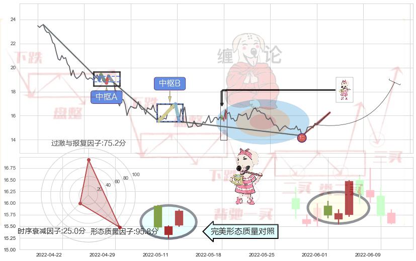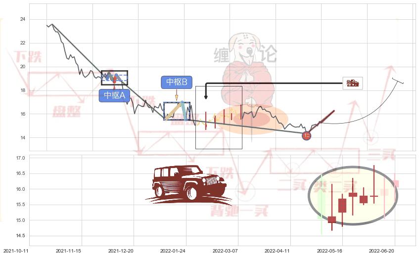 ➣ 【中枢B】:2022-04-11-2022-04-26,中枢由3笔构成,共12交易日, ZG=16.99, ZD=15.53
