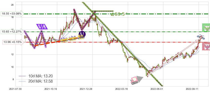 ♘ 阻力价格位15.65,可信任强度54.86%,距离最后交易2022-08-12形成的收盘价格13.94相差 +12.27%