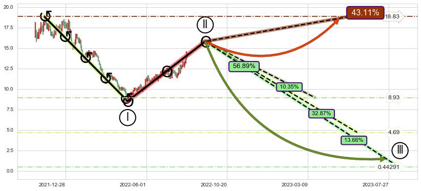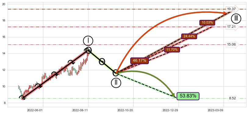 ➢ 循环浪继续向上【最低】位置(2023-01-13, 15.06),匹配聚类样本比例25.33%, 可能性概率11.70%