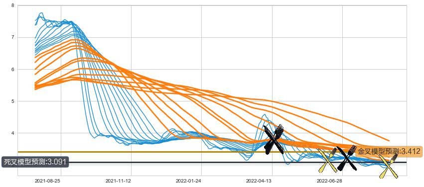 ➣ 60小时均线于(2022-04-14: 3.718)形成【死叉】基于【死叉历史模型】预测死叉后最低波谷价格: 3.140, 死叉后最低价格2.880,已经下跌超出预测最低波谷价格, 预期反弹