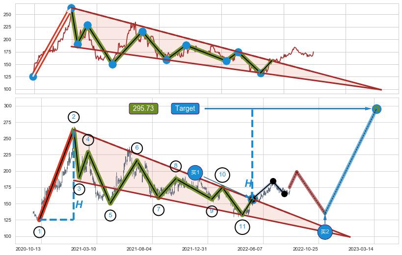 ➢ 最小中继整理涨幅→𝐇: 126.34 (高点逐步降低斜边第一阻力点②与支撑边垂直距离)