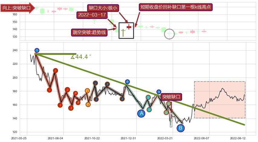 ➢ 收盘价(2022-03-28: 133.40 )→回踩→第一根k线高点(2022-03-16: 139.77 )