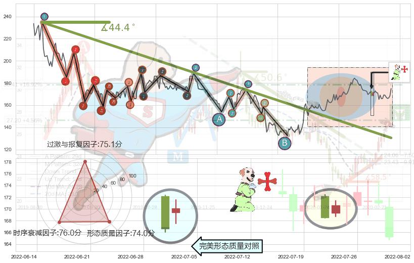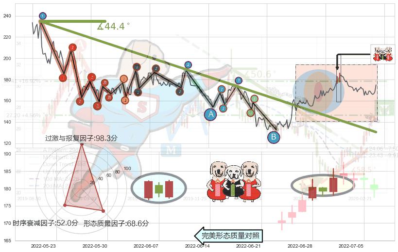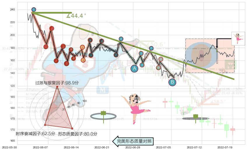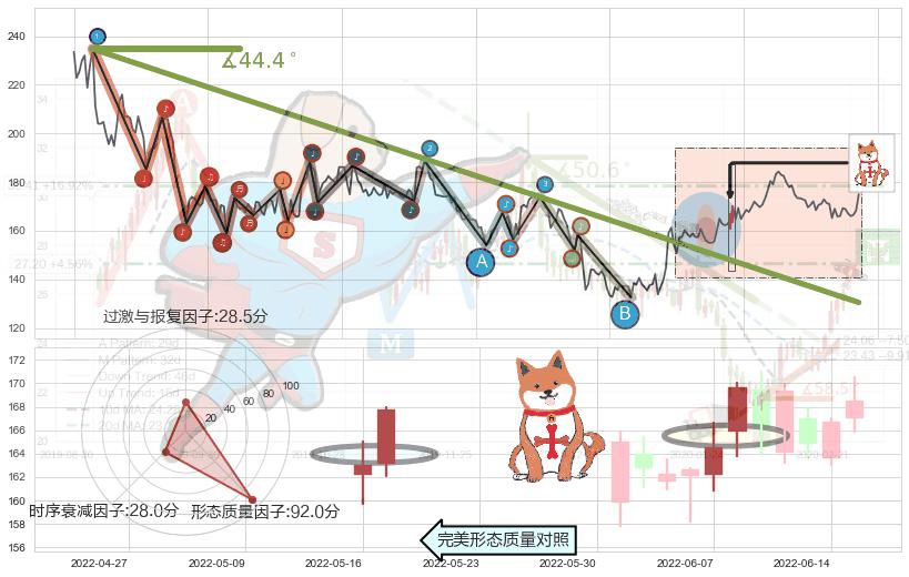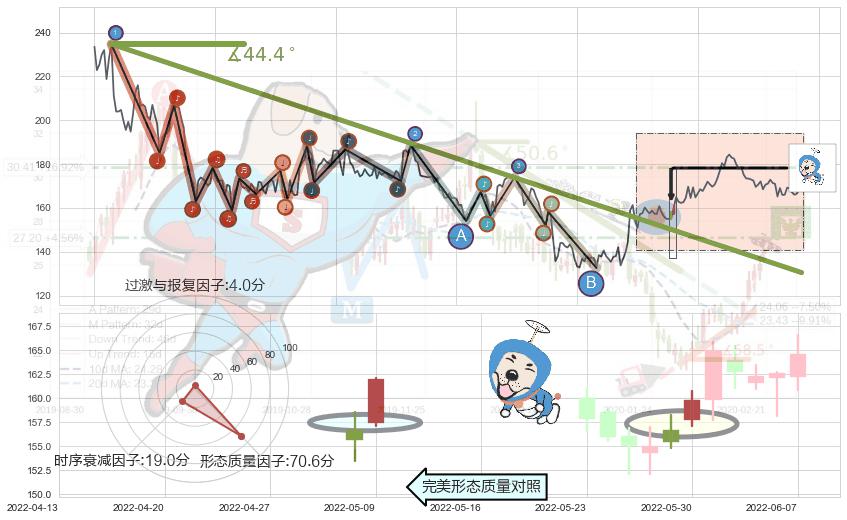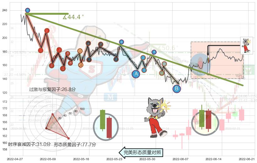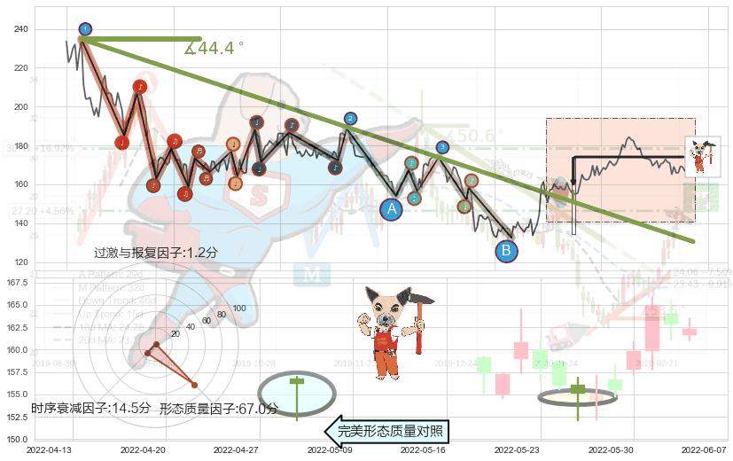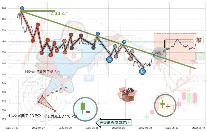 从2021-06-10至2022-04-29,共包含216个交易日,阶段股价下跌-30.72%,阶段股价变动位移路程比: 1 : 13,下跌趋势角度: 44.4