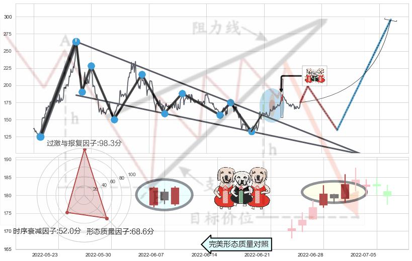 ➣ 上涨螺旋桨形态 + 降楔型阻力突破转换支撑上涨信号叠加后【目标达成率】低,【看多】信号叠加【存续影响大】