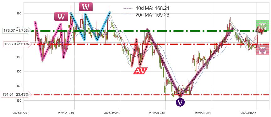 ♘ 阻力价格位178.07,可信任强度90.61%,距离最后交易2022-08-12形成的收盘价格175.01相差 +1.75%