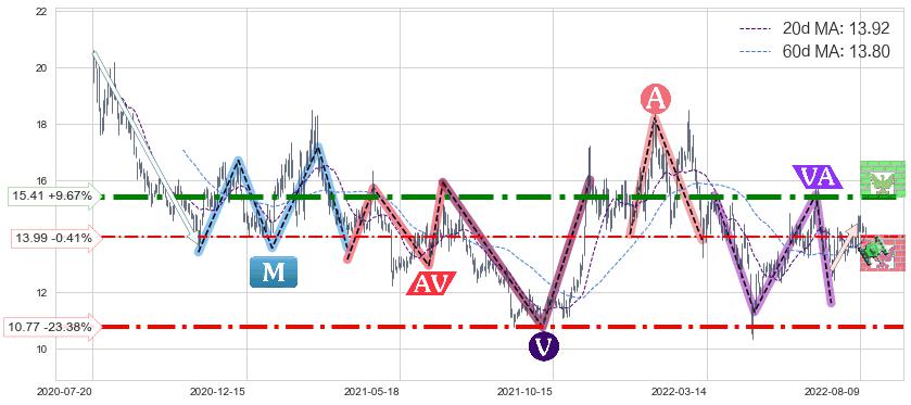 ♘ 支撑价格位13.99,可信任强度38.48%,距离最后交易2022-08-12形成的收盘价格14.05相差 -0.41%