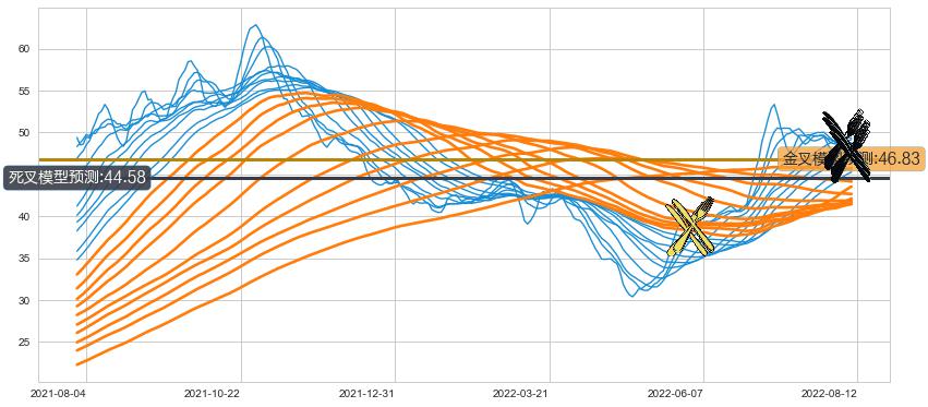 ➣ 40小时均线于(2022-08-11: 47.86)形成【死叉】基于【死叉历史模型】预测死叉后最低波谷价格: 44.33, 死叉后最低价格47.10,尚未达到预测最低波谷价格, 预期继续下跌