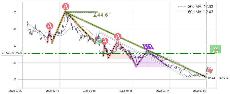 从2021-01-08至2022-05-27,共包含333个交易日,阶段股价下跌-123.33%,阶段股价变动位移路程比: 1 : 6,下跌趋势角度: 44.6,2021-06-01向↘︎形成缺口,跳空下跌-28.52%˚