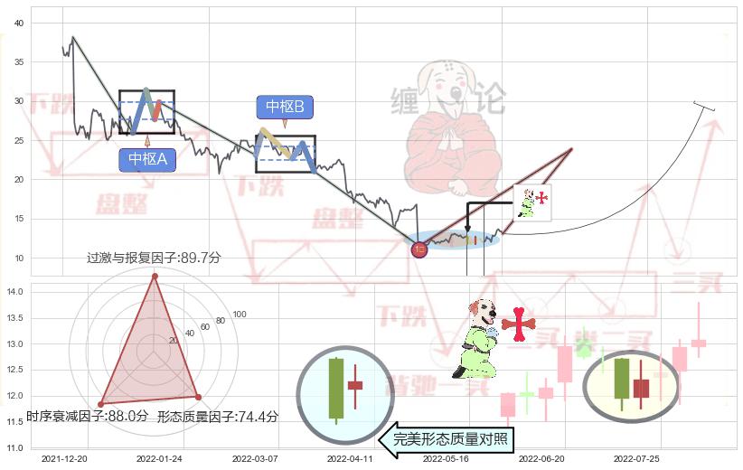 从2021-04-12至2022-08-12,共包含327个交易日,阶段股价下跌-69.06%,阶段股价变动位移路程比: 1 : 10,2021-06-01向↘︎形成缺口,跳空下跌-28.52%˚