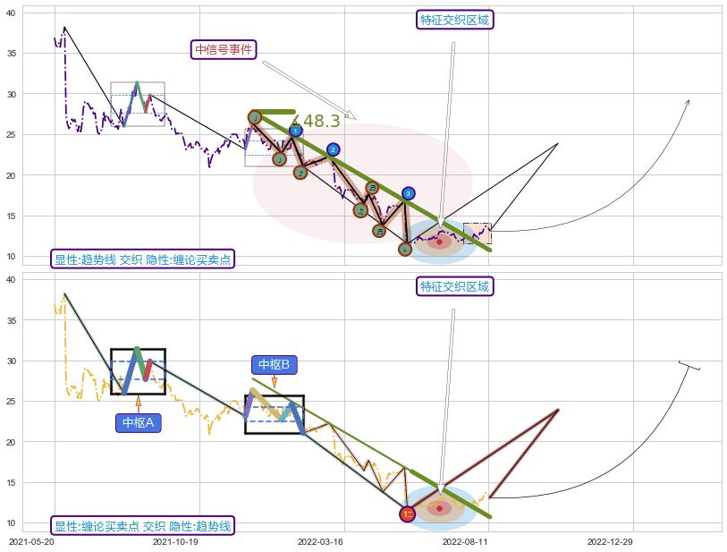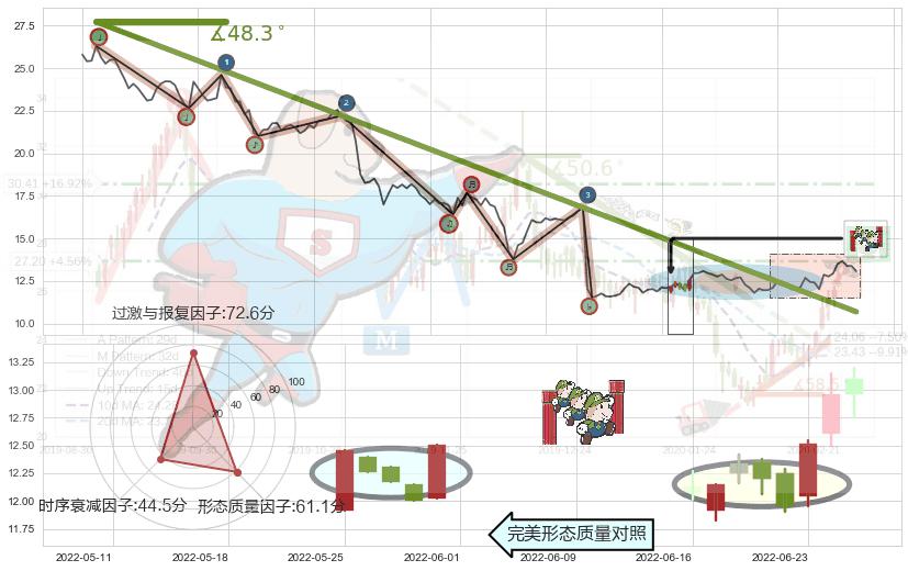 从2021-12-09至2022-05-27,共包含111个交易日,阶段股价下跌-72.95%,阶段股价变动位移路程比: 1 : 3,下跌趋势角度: 48.3,2022-05-23向↘︎形成缺口,跳空下跌-28.50%˚