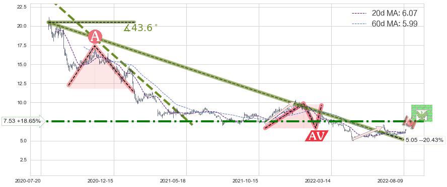 🦴 长线均值回复组合短线趋势跟踪[强阻力信号]2020-08-03-2022-06-28下跌趋势依然成立(下跌趋势跟踪依然存在),短线价格略微上行反弹(均值回复猜想),即将接近下跌趋势提供的未破位阻力价格:5.05。