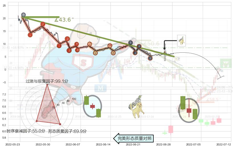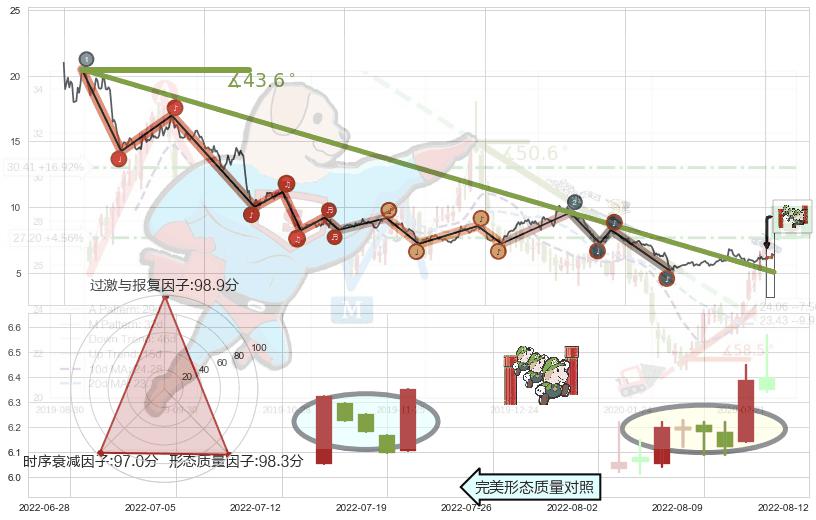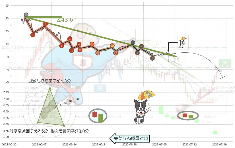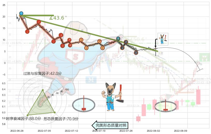 从2020-08-03至2022-06-28,共包含461个交易日,阶段股价下跌-105.09%,阶段股价变动位移路程比: 1 : 8,下跌趋势角度: 43.6