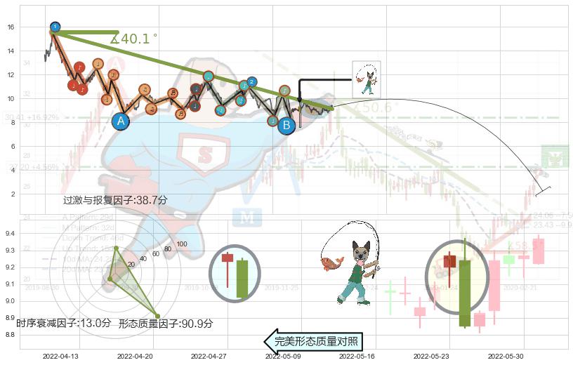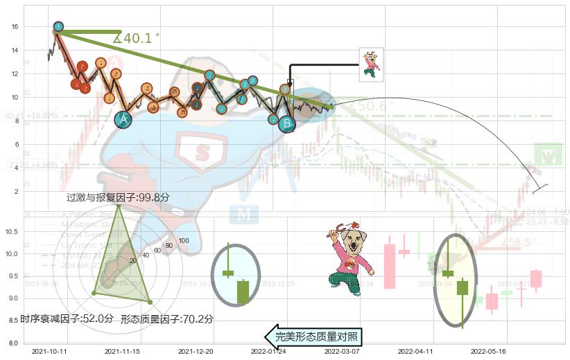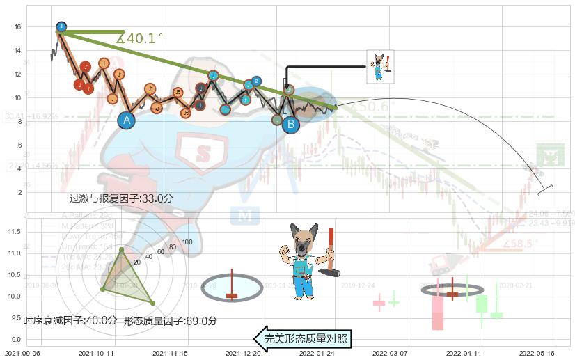 从2020-08-03至2022-06-06,共包含445个交易日,阶段股价下跌-39.90%,阶段股价变动位移路程比: 1 : 15,下跌趋势角度: 40.1