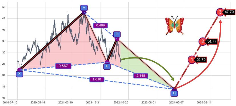 ➣ 未完成【蝴蝶】形态起点X: 2019-08-06, 已到达C点: 2022-06-30, 预测最终D点: 2024-01-31, 共1111交易日