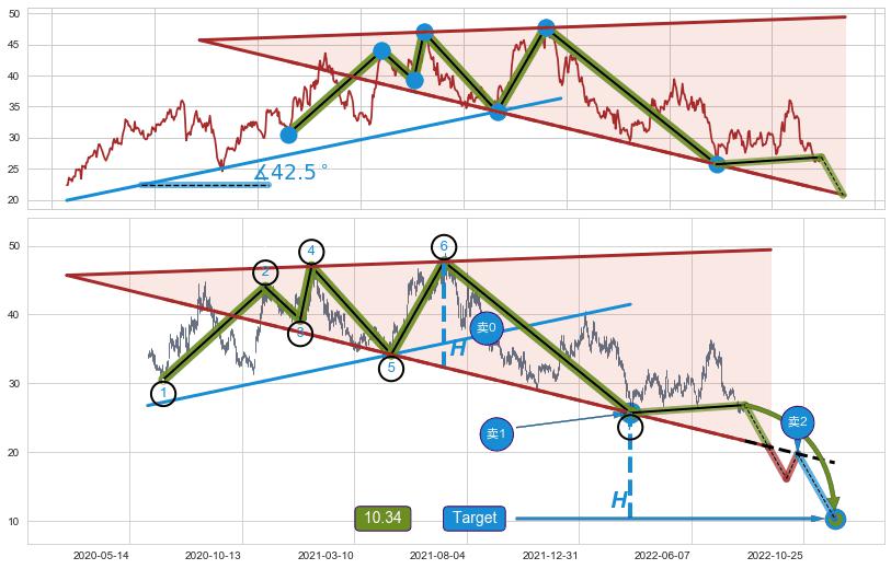 ➣ 扩散三角反转:猜想临近关键支撑位突破点 → 临近拐点下跌 → 风险信号 → 大趋势均值回复