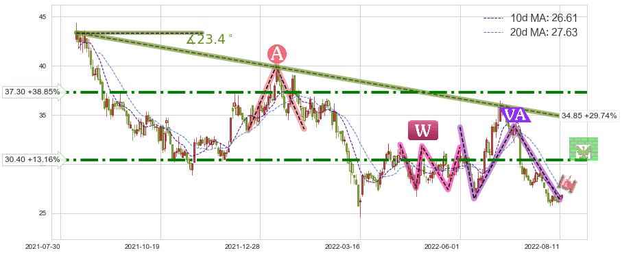 ♘ 阻力价格位37.30,可信任强度81.49%,距离最后交易2022-08-12形成的收盘价格26.86相差 +38.85%