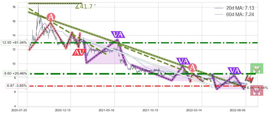 ♘ 在最后的下跌阶段2020-07-24至2022-07-01,存在 破位边缘的阻力位 ,阻力价格6.56,可信任强度82.32%,其距离最后价格7.14相差 -8.14%