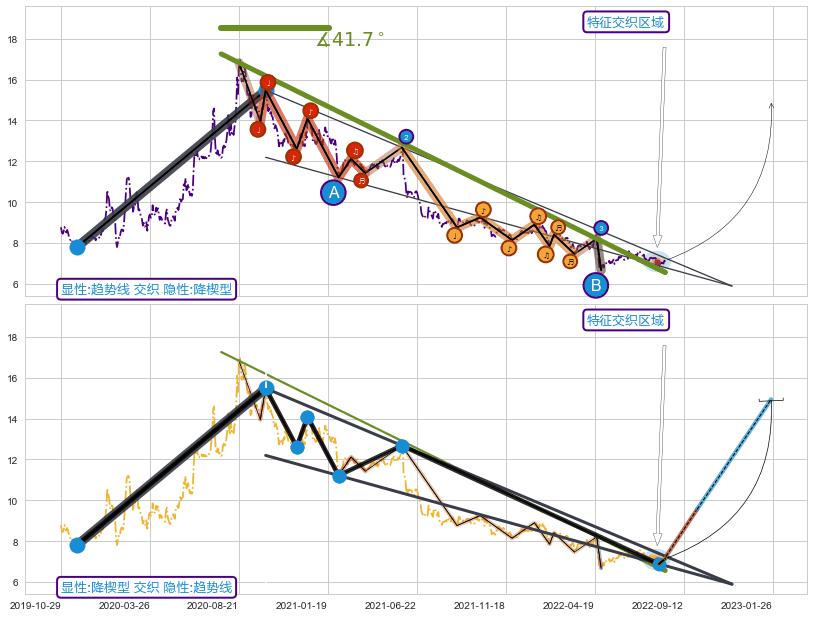 ➣ 降楔型:猜想临近关键阻力位突破点 → 临近拐点上涨 → 机会信号 → 大趋势均值回复