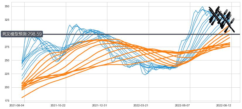 ➣ 70小时均线于(2022-08-11: 314.21)形成【死叉】基于【死叉历史模型】预测死叉后最低波谷价格: 284.27, 死叉后最低价格311.93,尚未达到预测最低波谷价格, 预期继续下跌