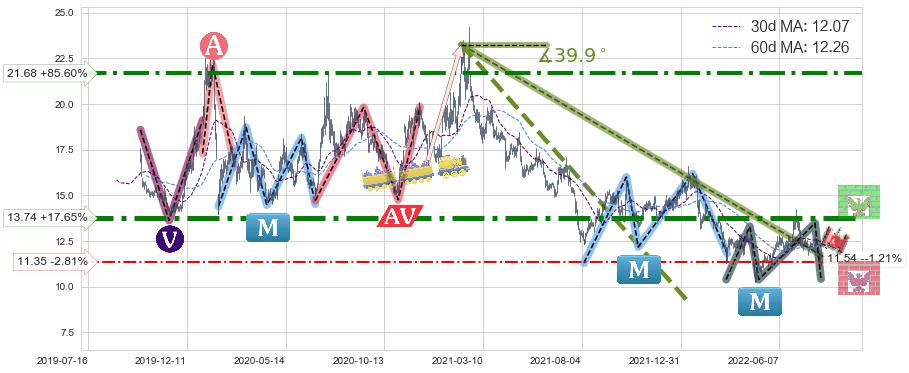 ➢ 【仅预测突破】最后价格:11.68与预测突破价格:14.54→【空间较大】后续最小【反转】第一目标价格→(2022-11-11: 17.20 )