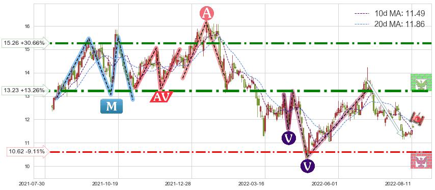 ♘ 阻力价格位13.23,可信任强度91.80%,距离最后交易2022-08-12形成的收盘价格11.68相差 +13.26%