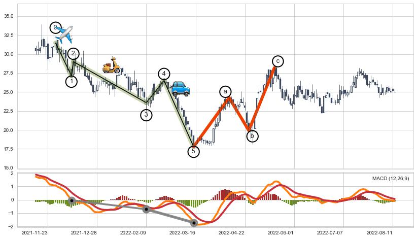 ➣ 波浪理论:猜想达到c点后小反弹终止反转下跌 → 下跌 → 【拐点】临近 → 阶段均值回复结束后继续大周期趋势跟踪